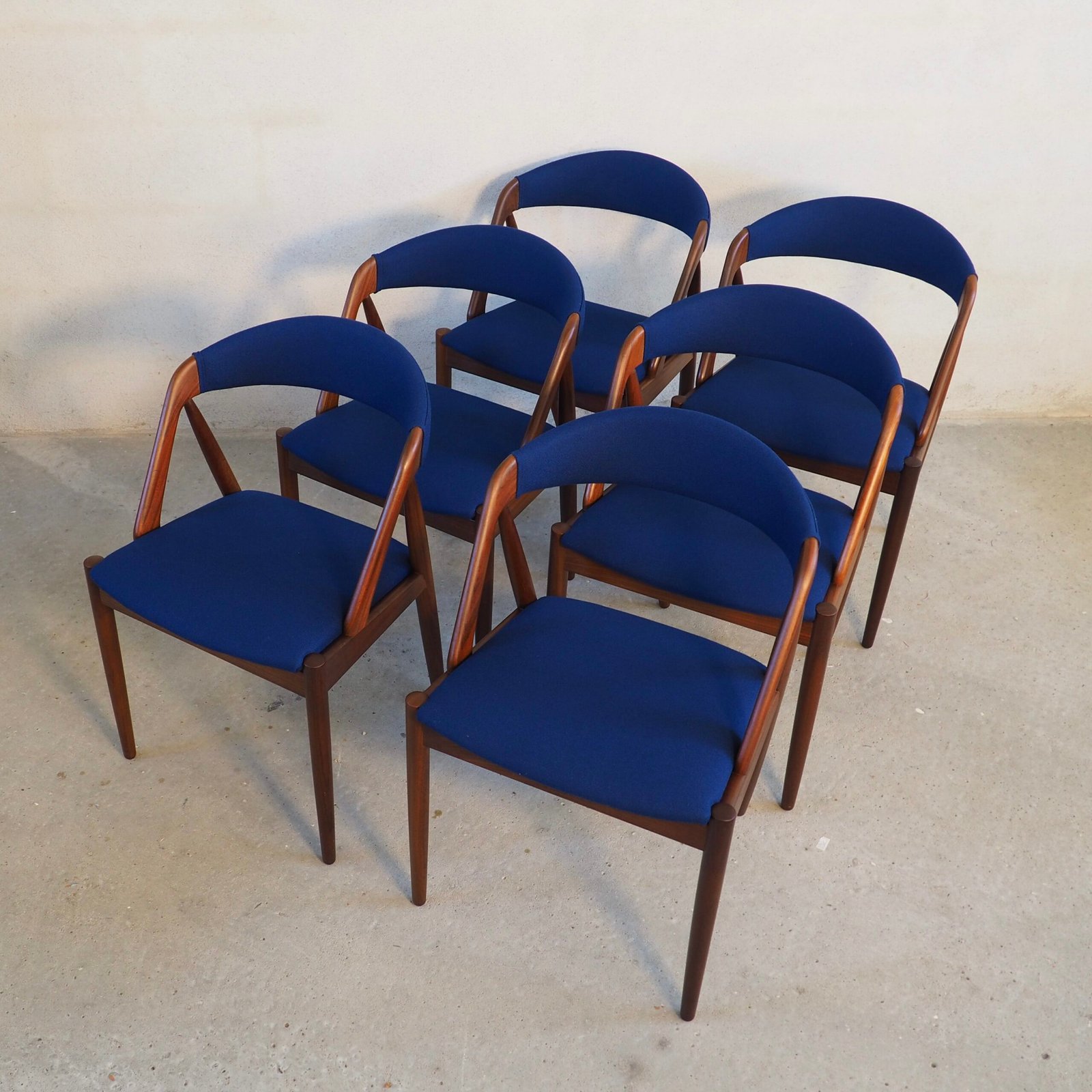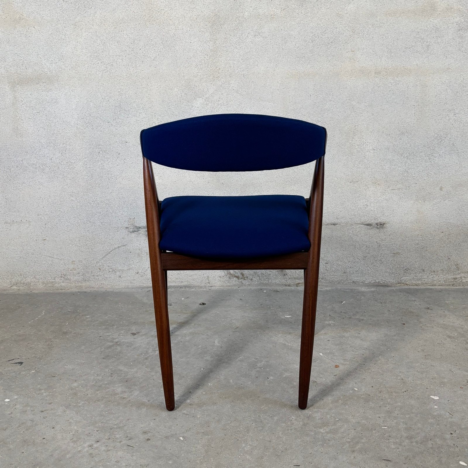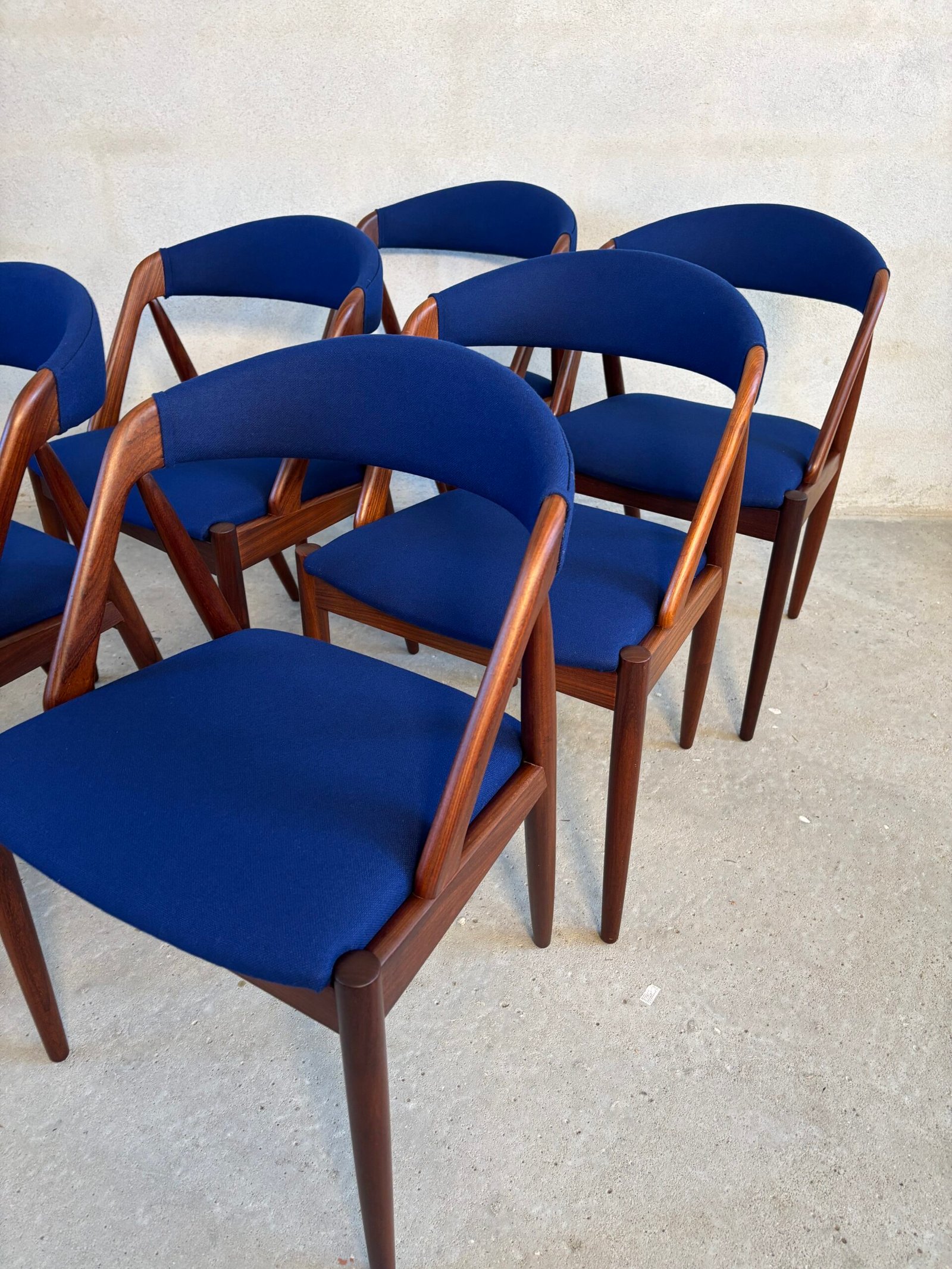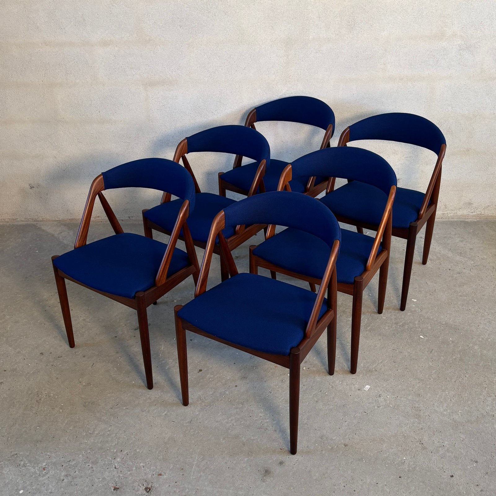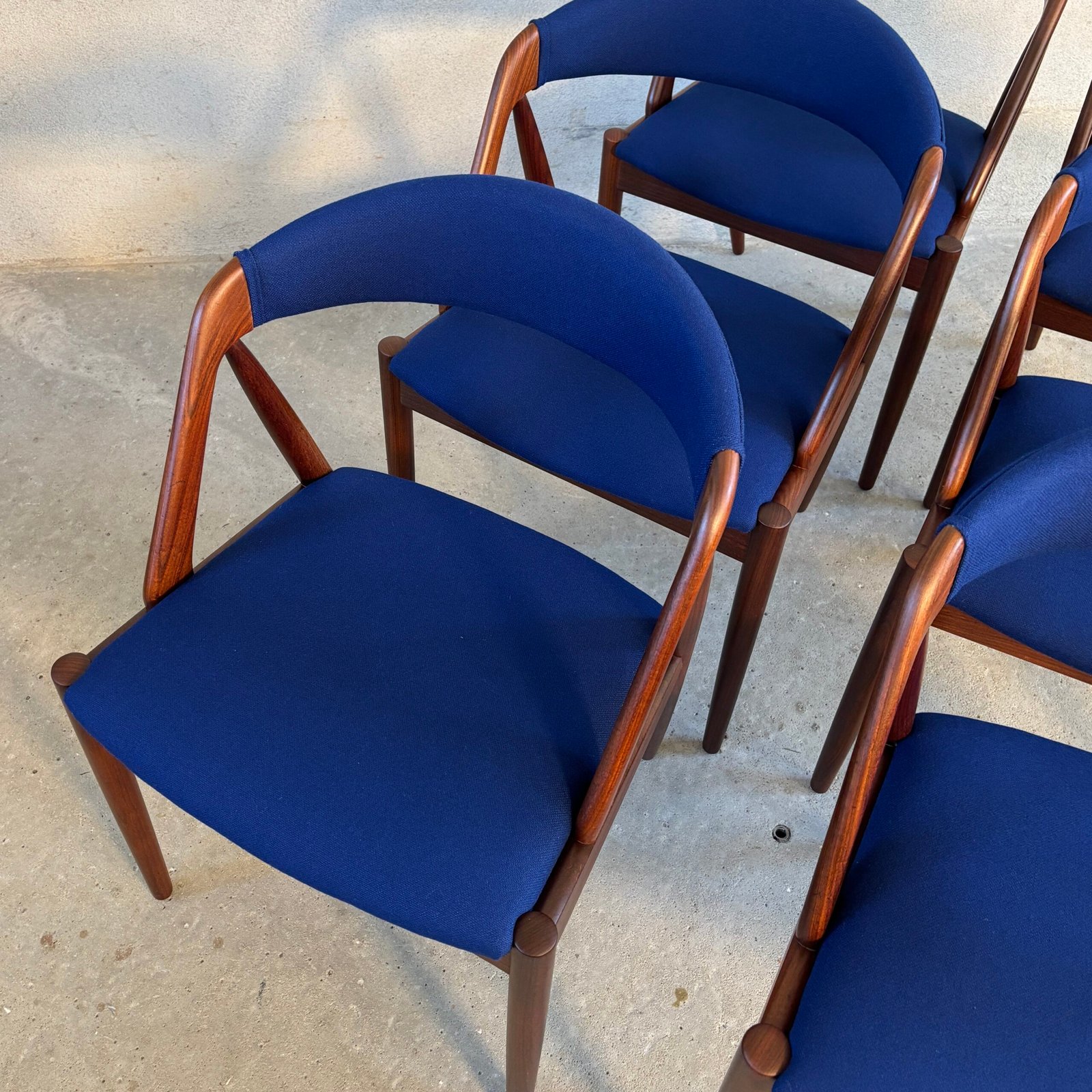 The seats are newly upholstered in premium dark blue wool fabric from Kvadrat, combining vintage charm with modern luxury. Fully restored and ready to bring Danish design heritage into your dining space.