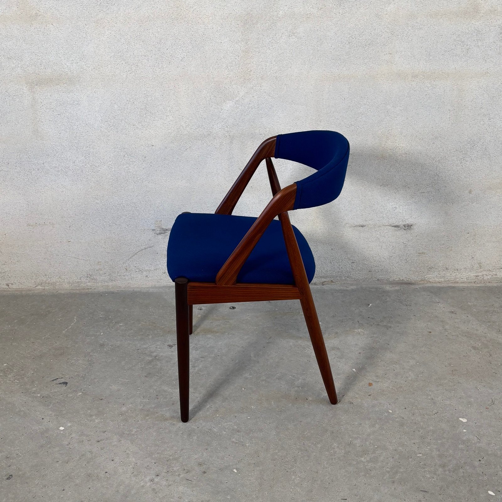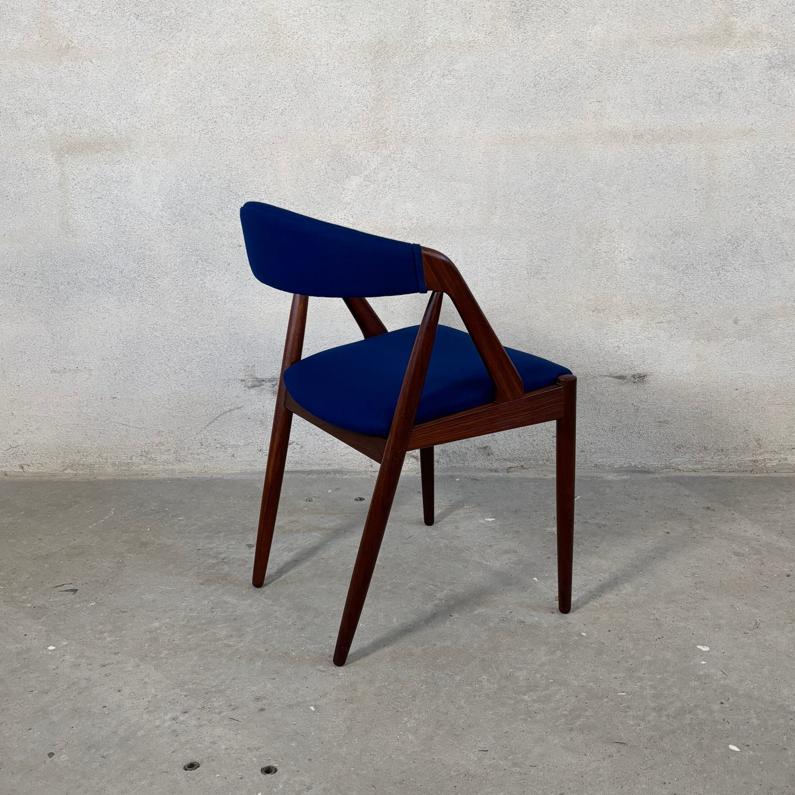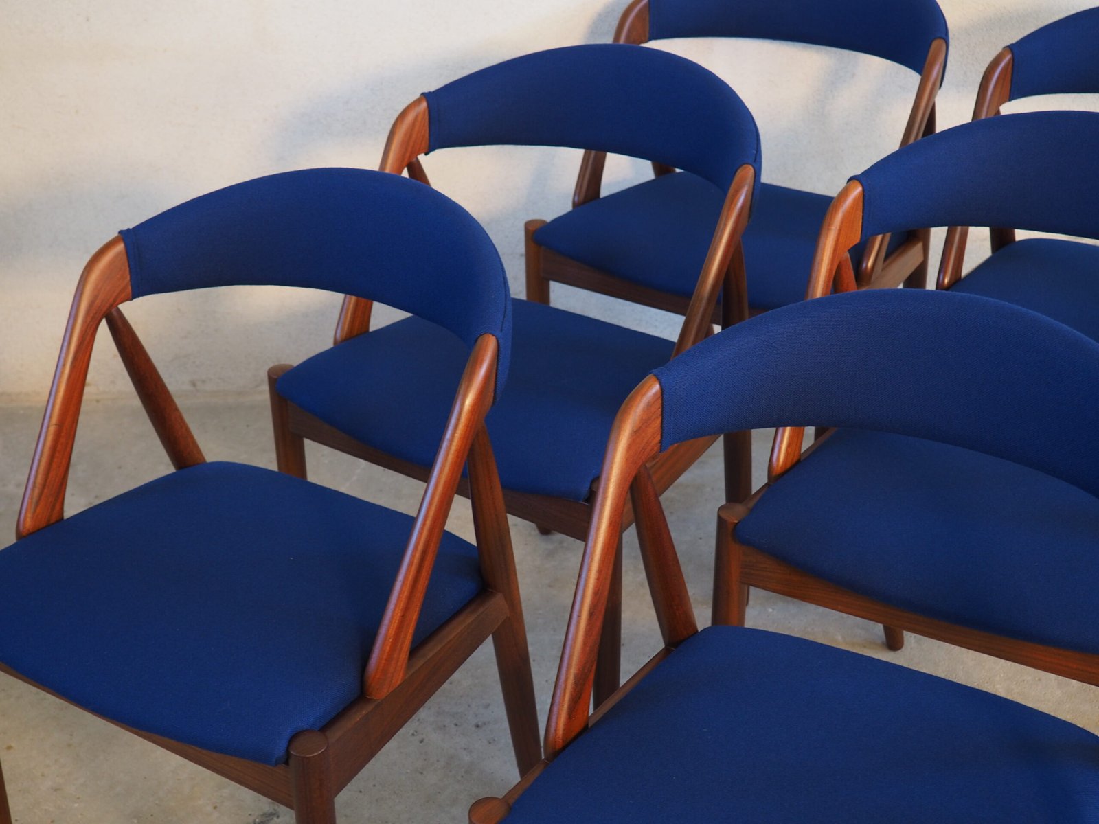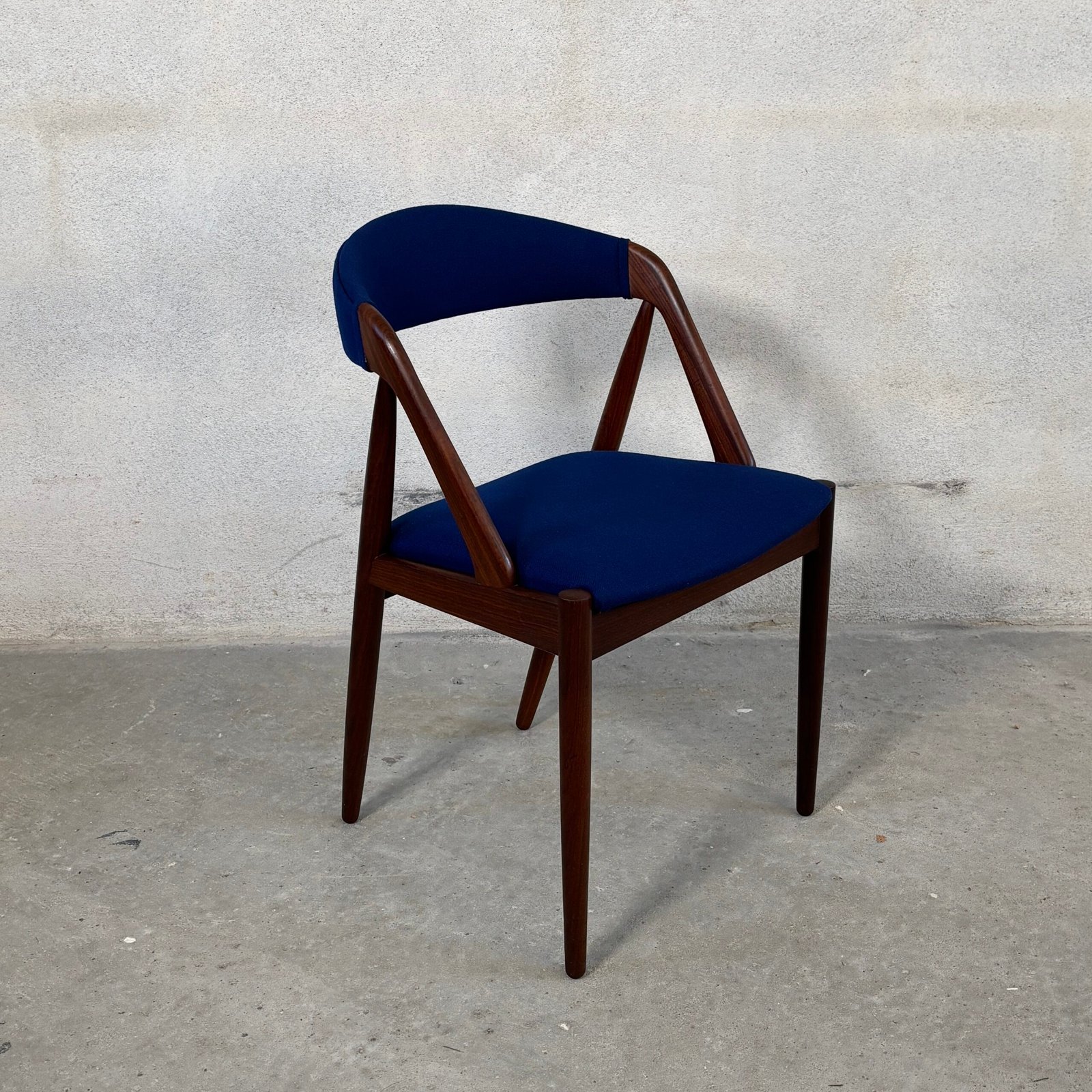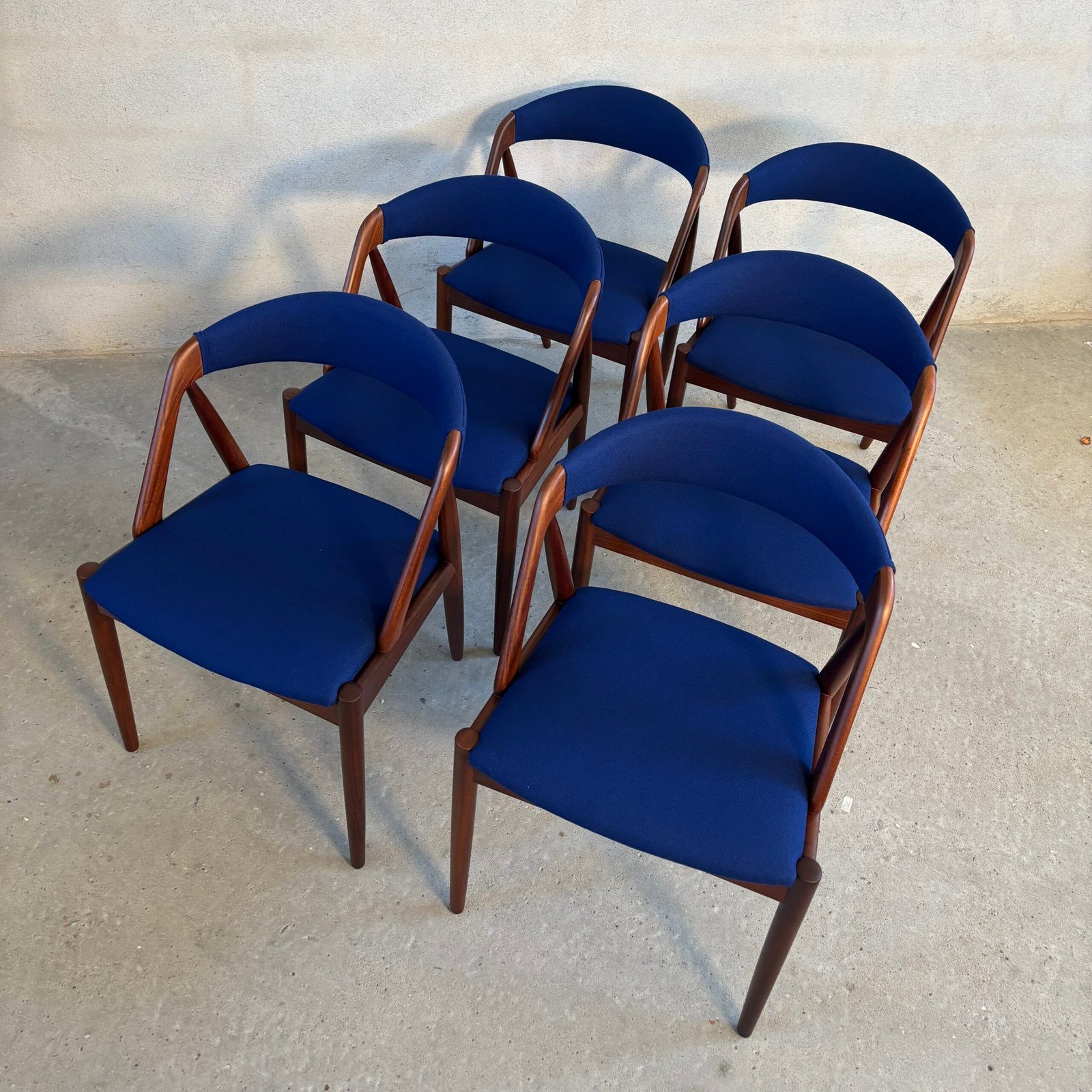 The seats are newly upholstered in premium dark blue wool fabric from Kvadrat, combining vintage charm with modern luxury. Fully restored and ready to bring Danish design heritage into your dining space.