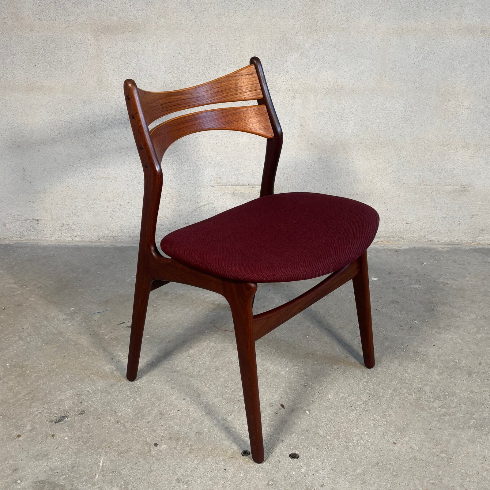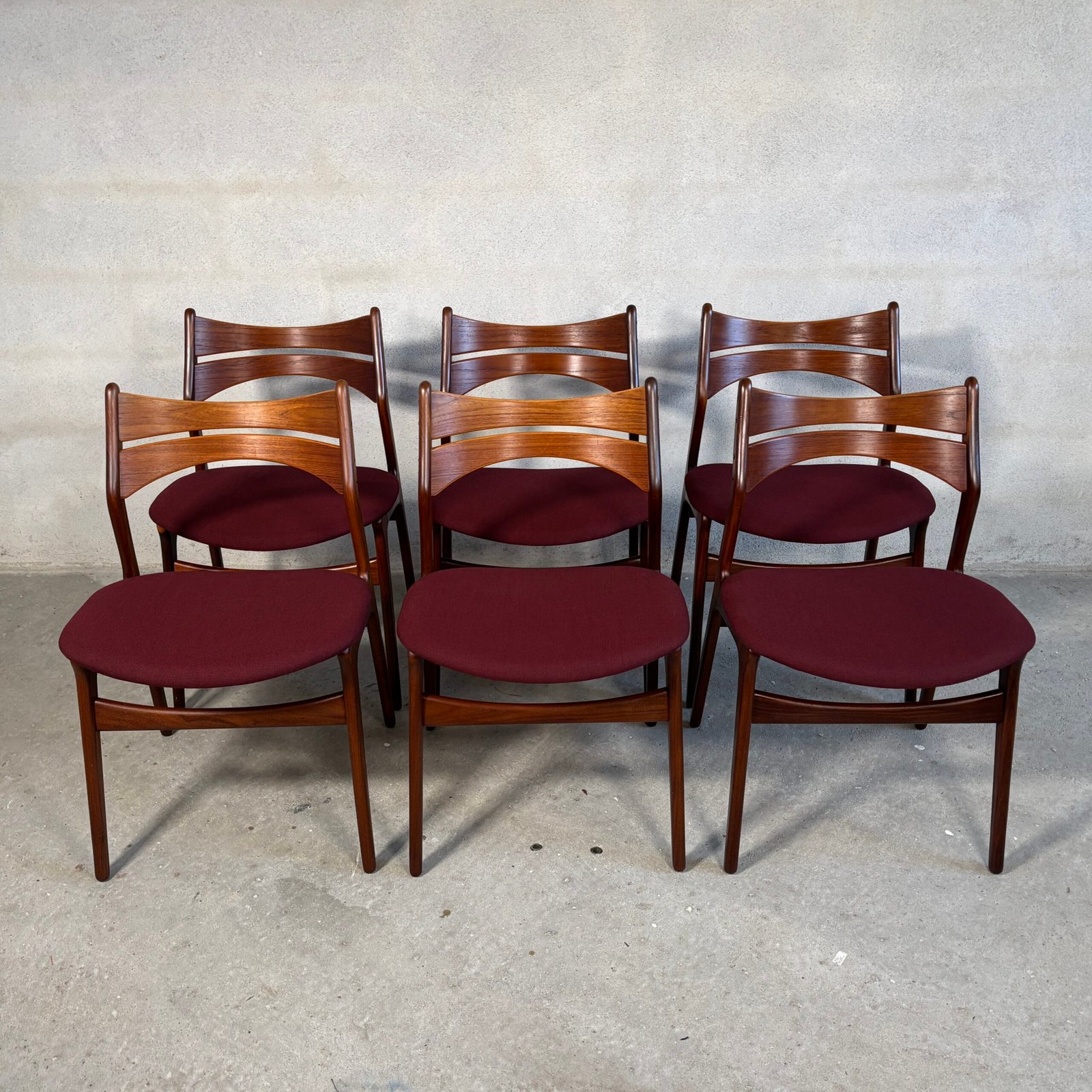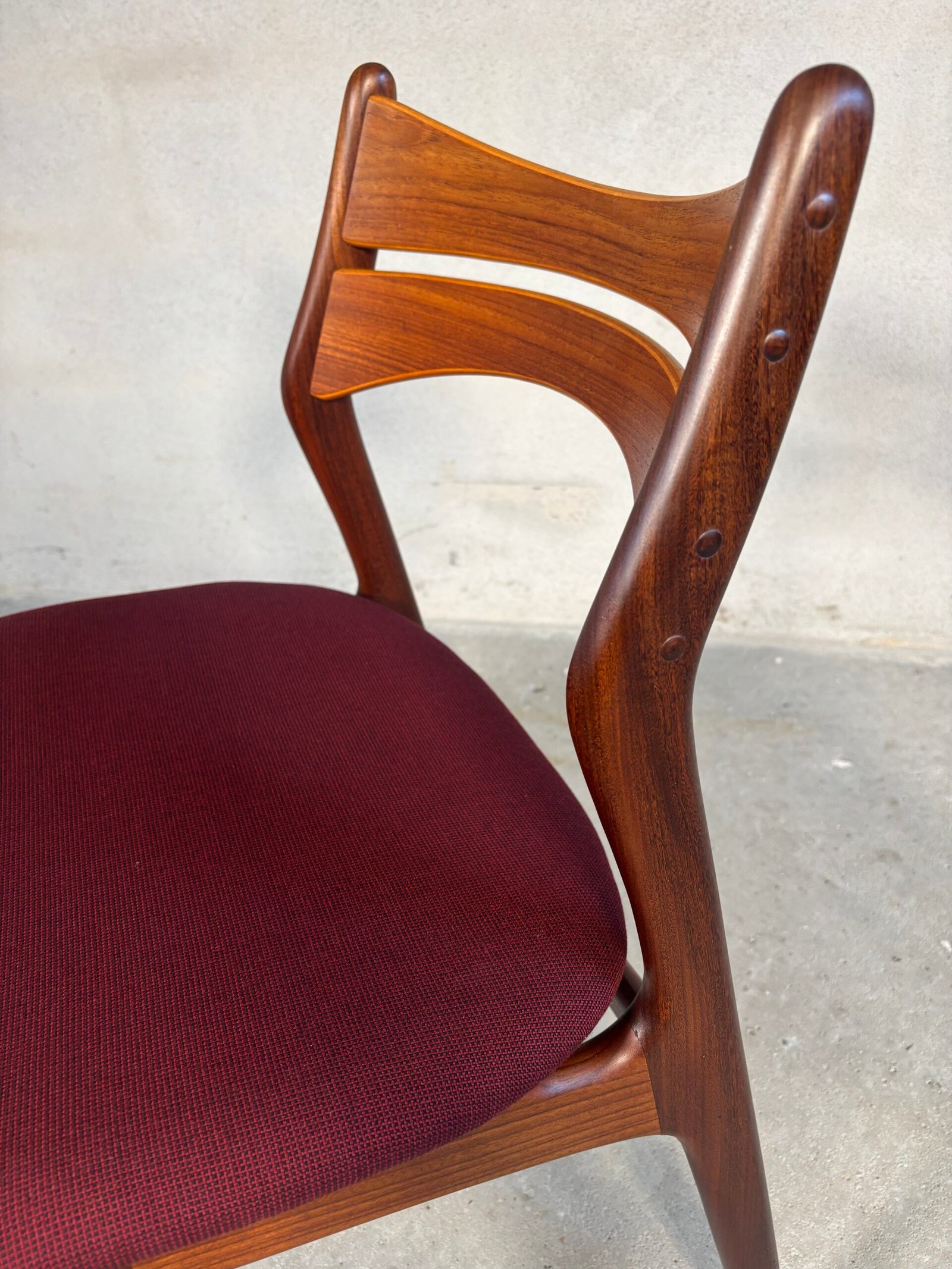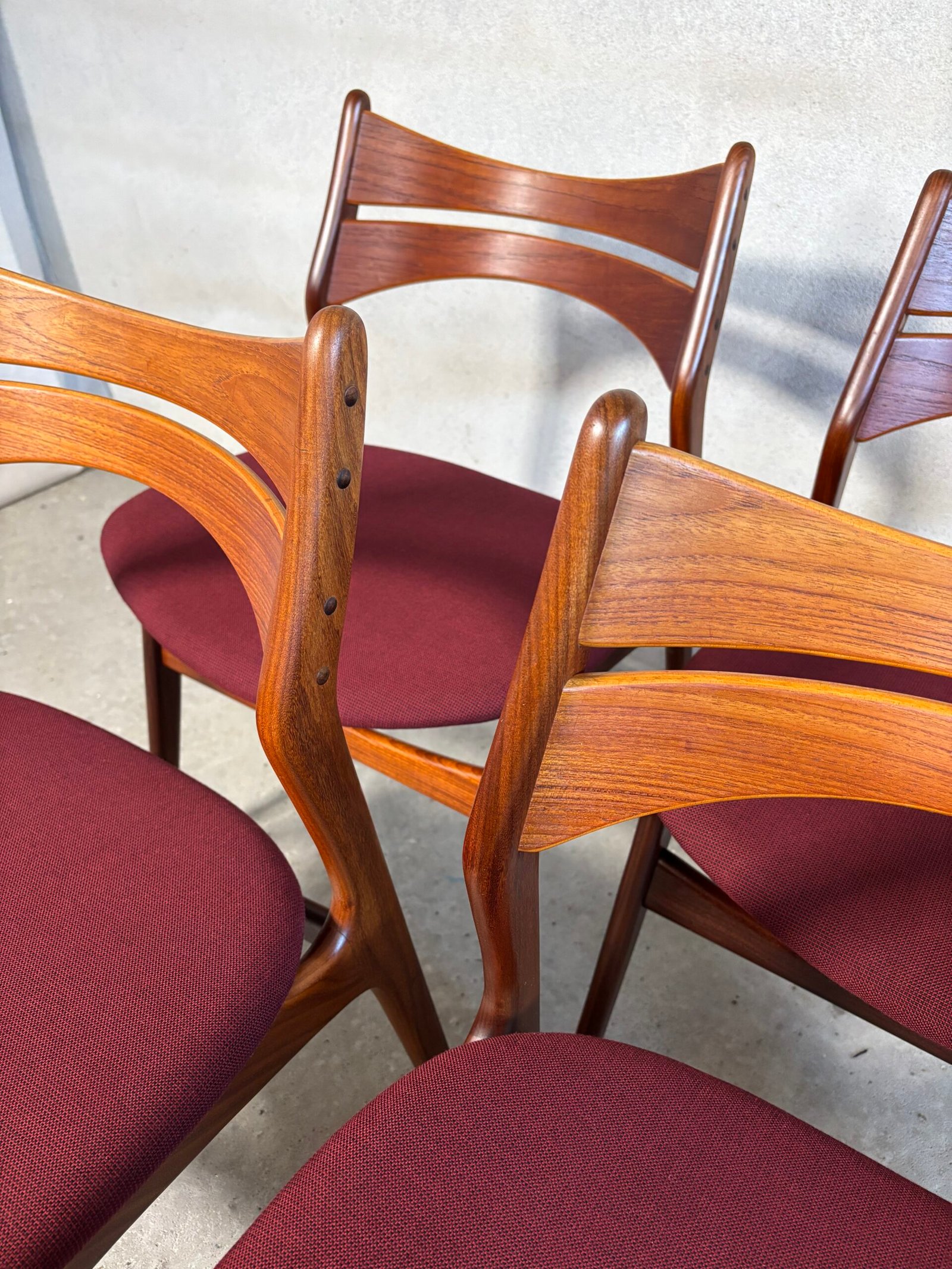 The solid teak frames offer durability and a warm natural tone, while the newly upholstered Kvadrat frabric in a deep burgundy/red shade adds depth and richness to the overall look. Fully restored, the chairs present a balanced and inviting aesthetic — suitable for both modern and classic interiors.