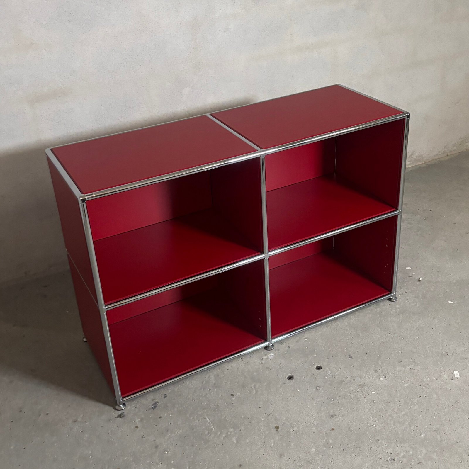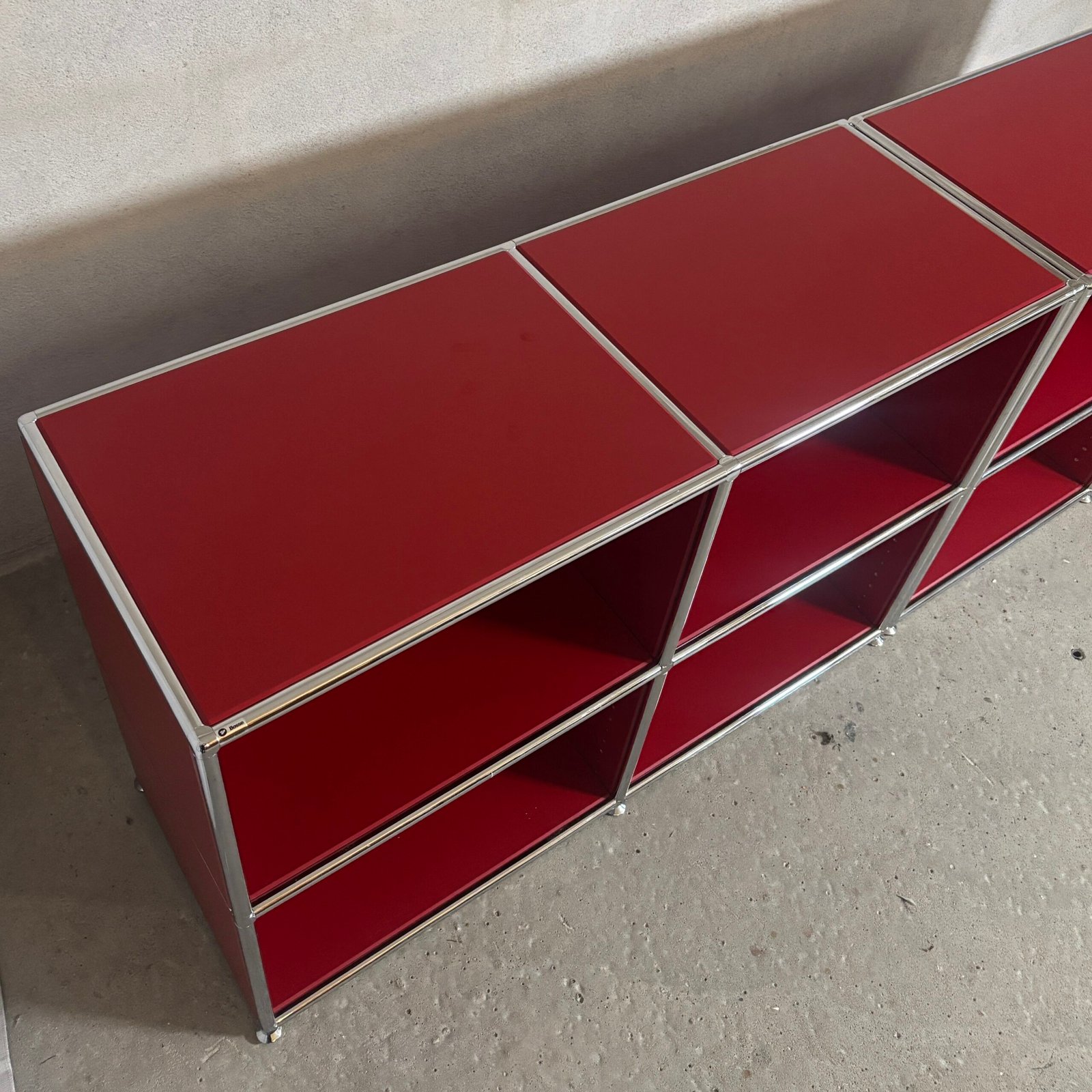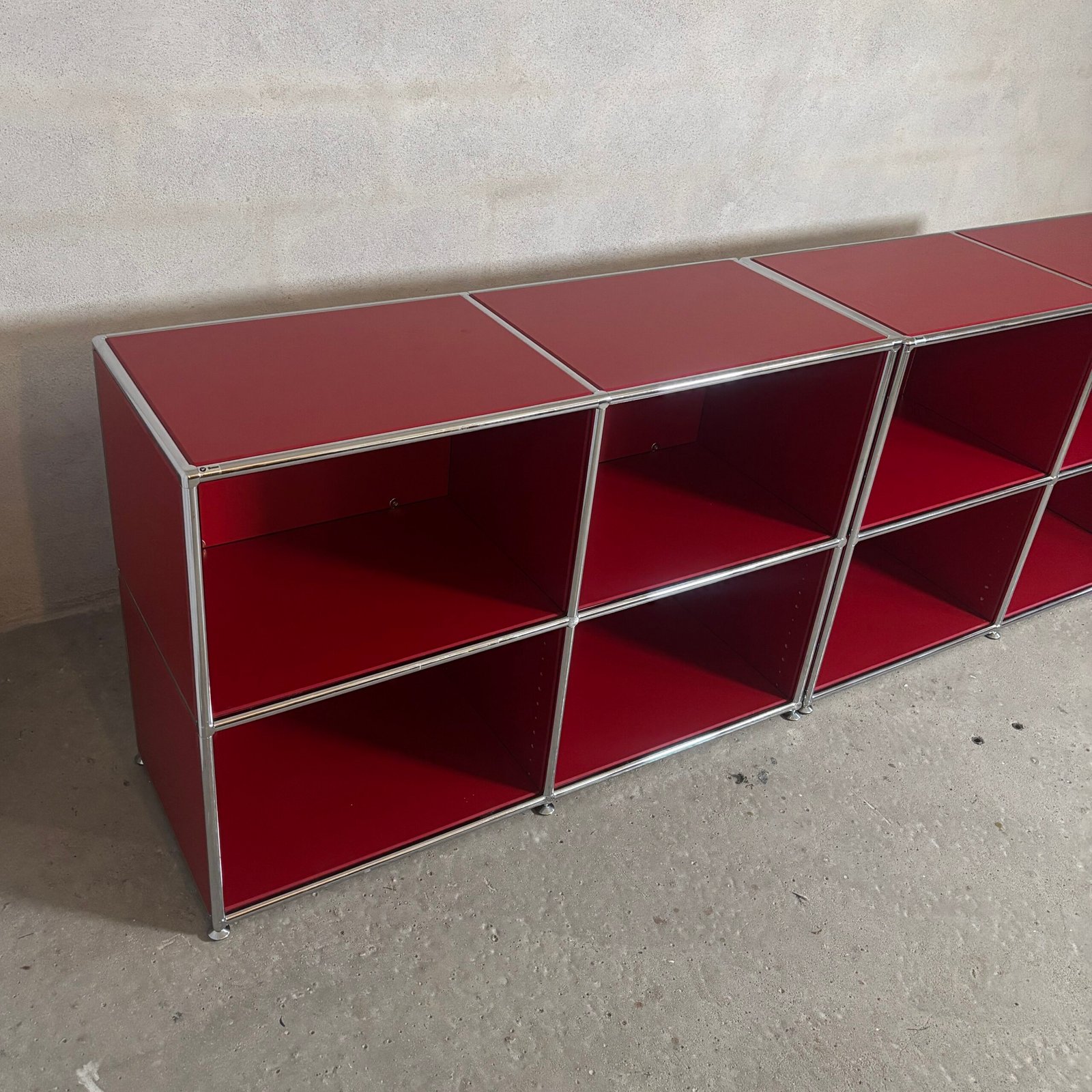 High-quality BOSSE modular system lowboard, a refined example of German design with clear Bauhaus roots. Featuring a chrome steel frame combined with lacquered panels in a deep red tone from the Les Couleurs Le Corbusier palette.