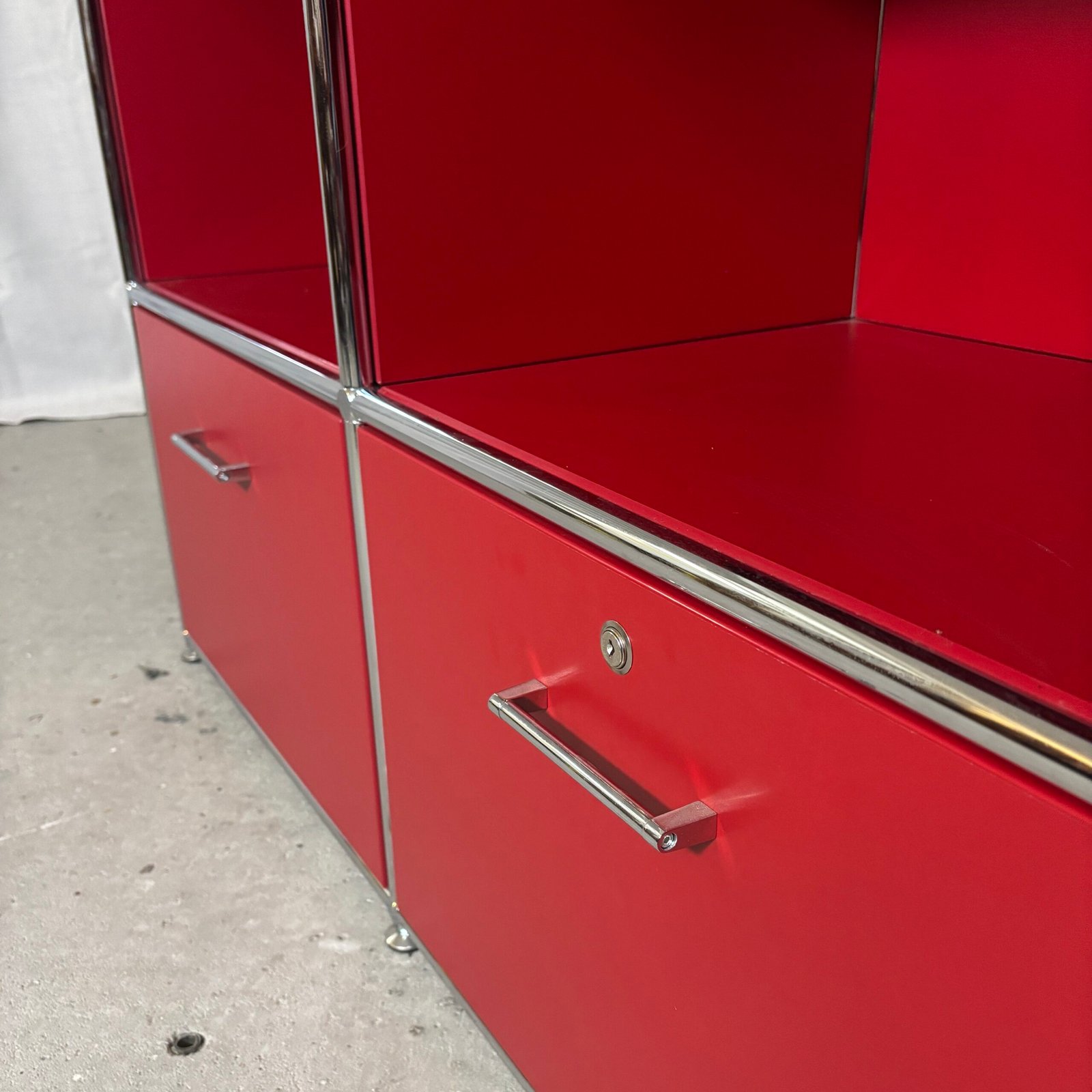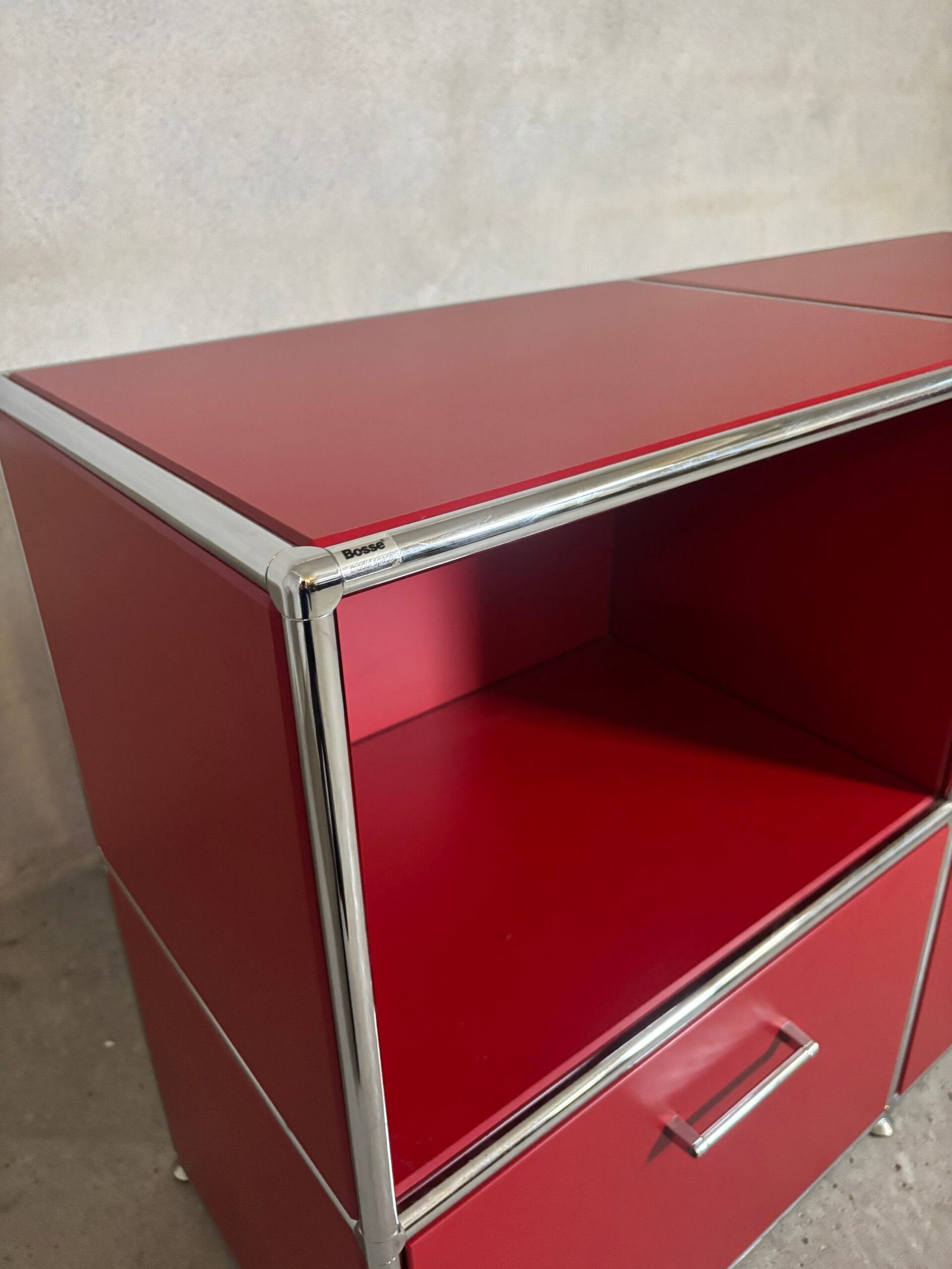 High-quality BOSSE modular system lowboard, a refined example of German design with clear Bauhaus roots. Featuring a chrome steel frame combined with lacquered panels in a deep red tone from the Les Couleurs Le Corbusier palette.