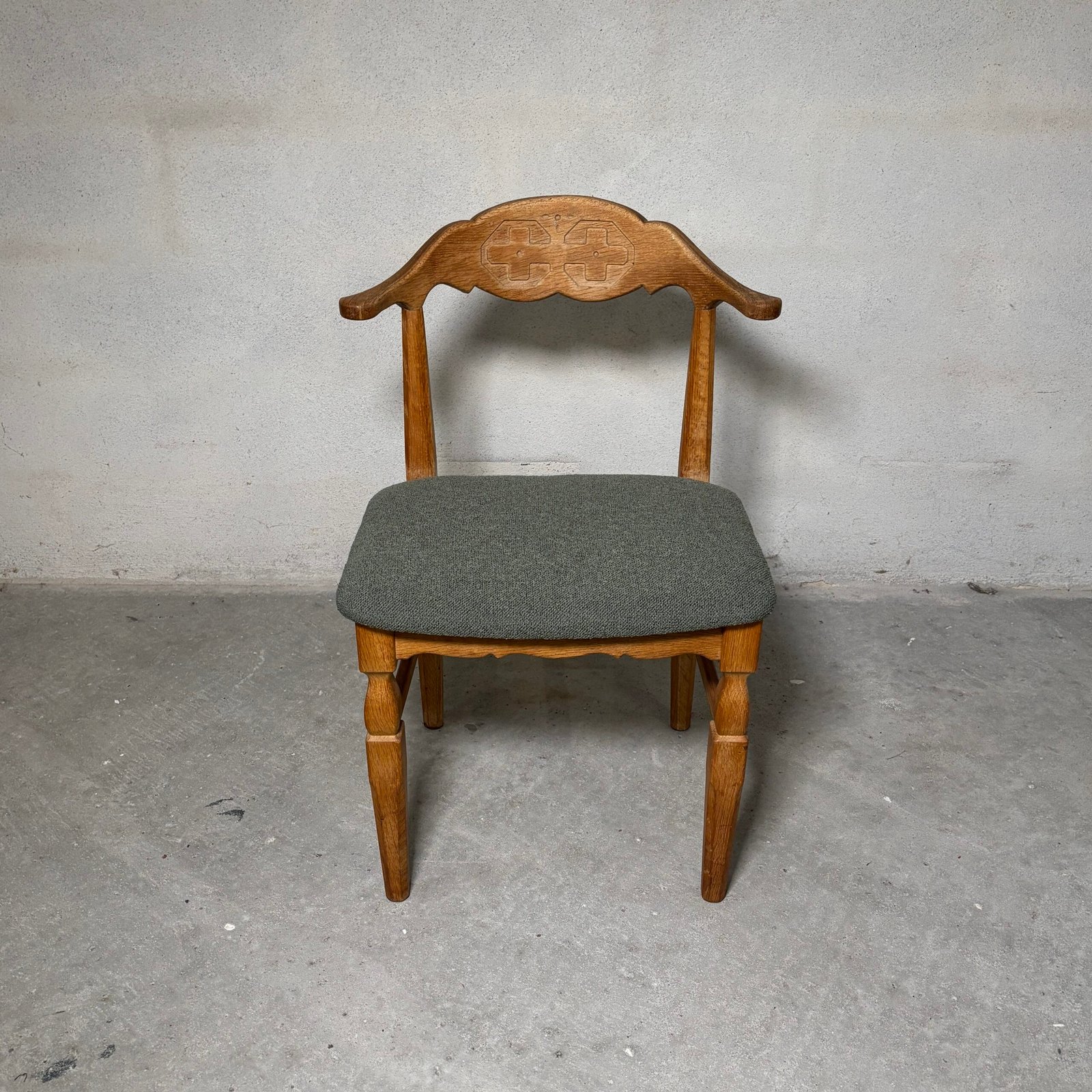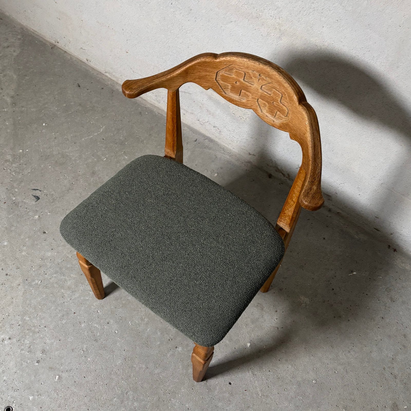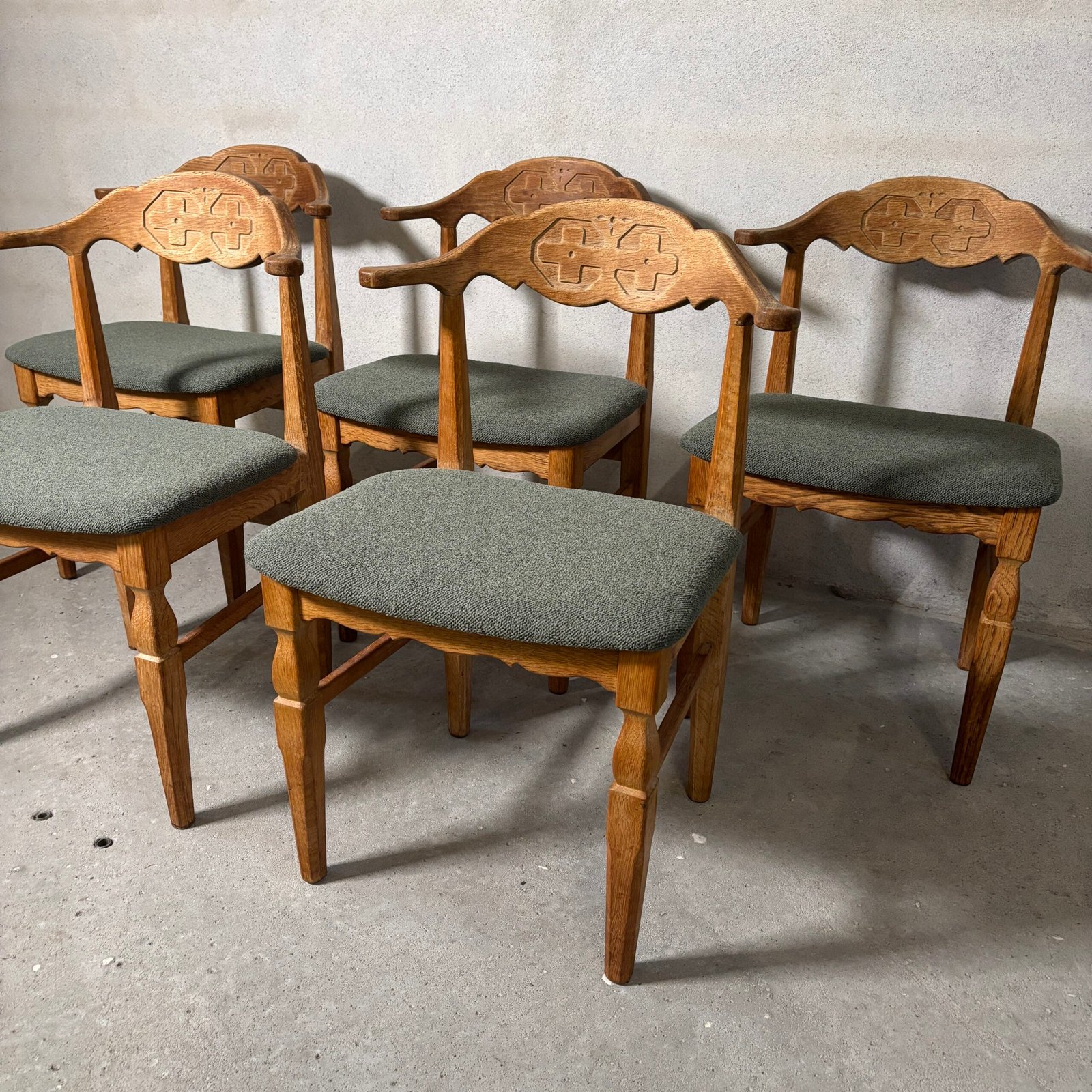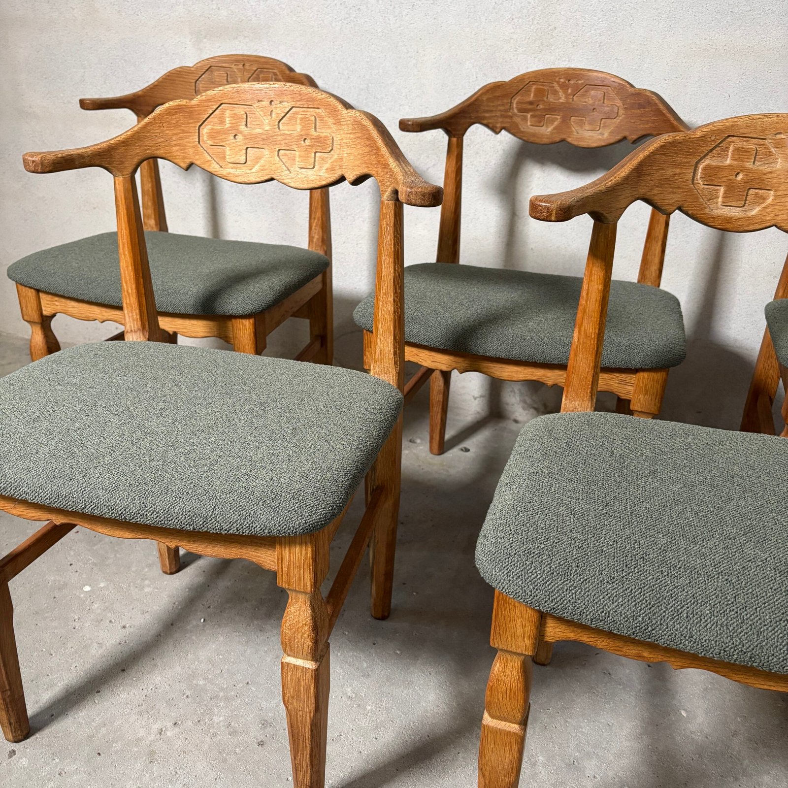 The chairs are in good vintage condition, featuring nicely patinated solid oak frames that have been cleaned and refinished. The seats are newly reupholstered in a forest green/grey boucle, giving them a rich, textured look that pairs perfectly with the warm oak tone.