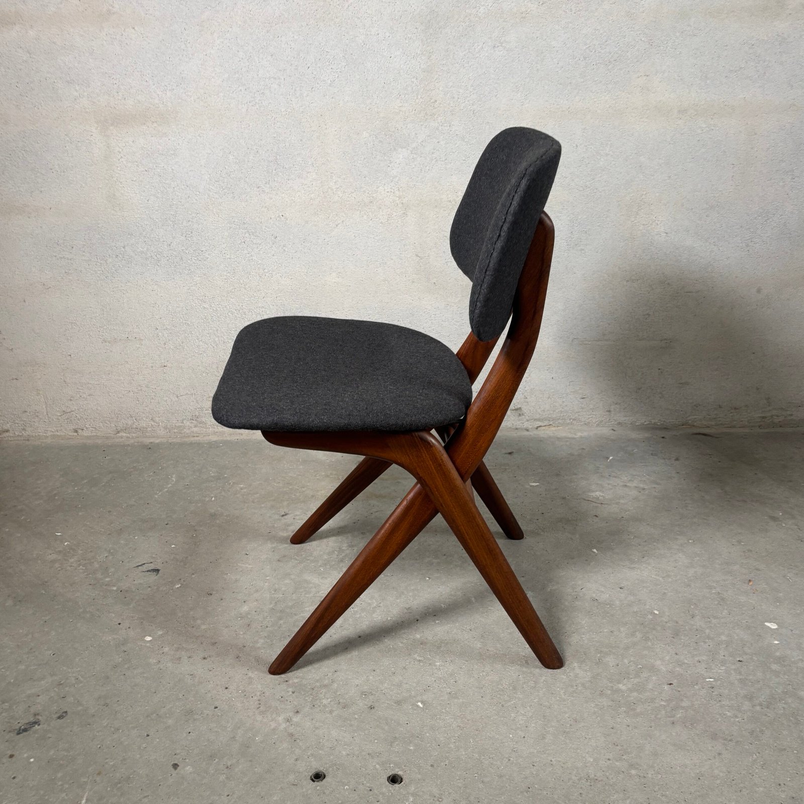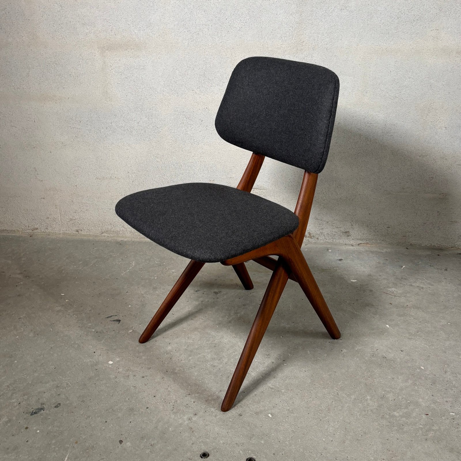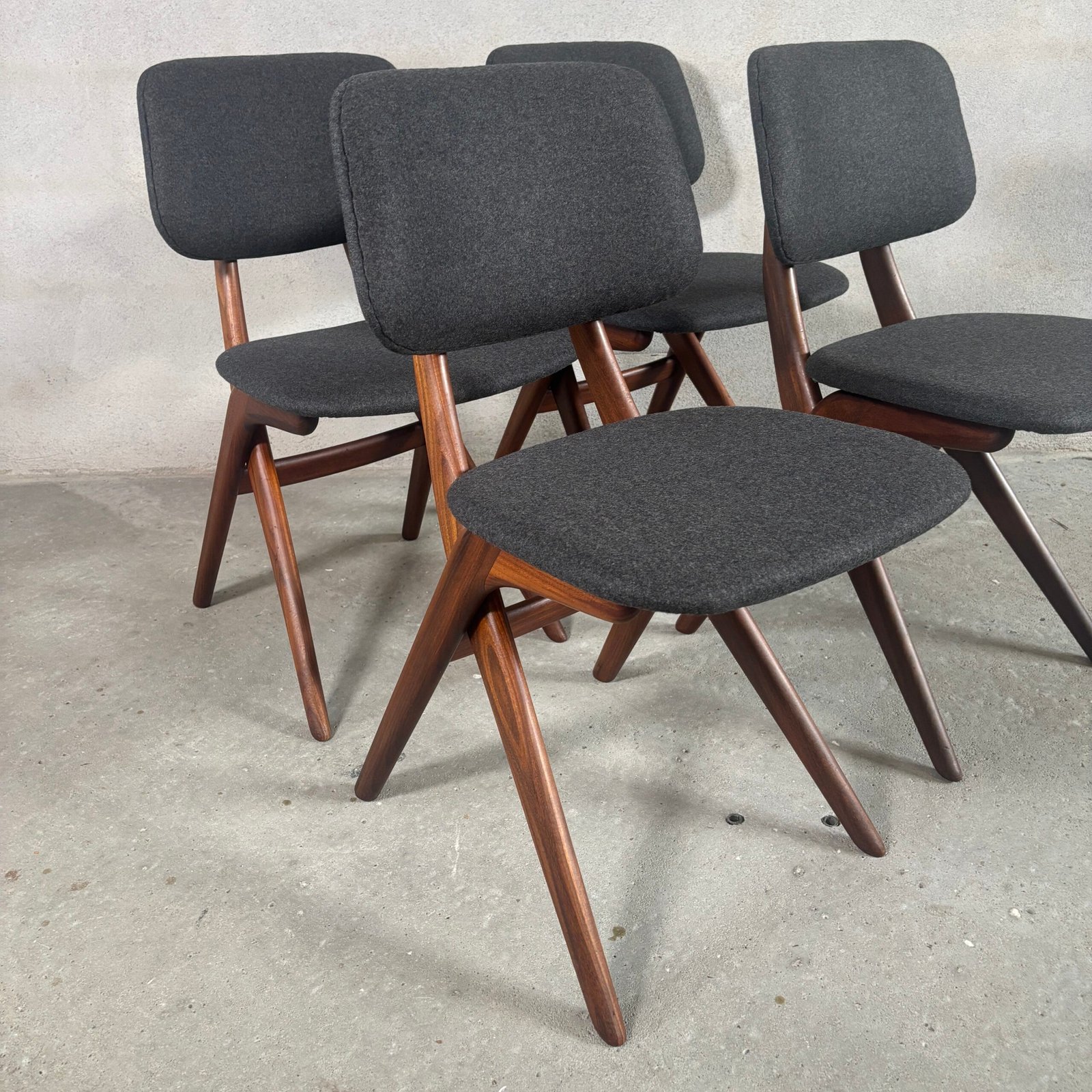 A striking set of four dining chairs by Louis van Teeffelen, often referred to as “Scissor Chairs” for their distinctive angular frame.