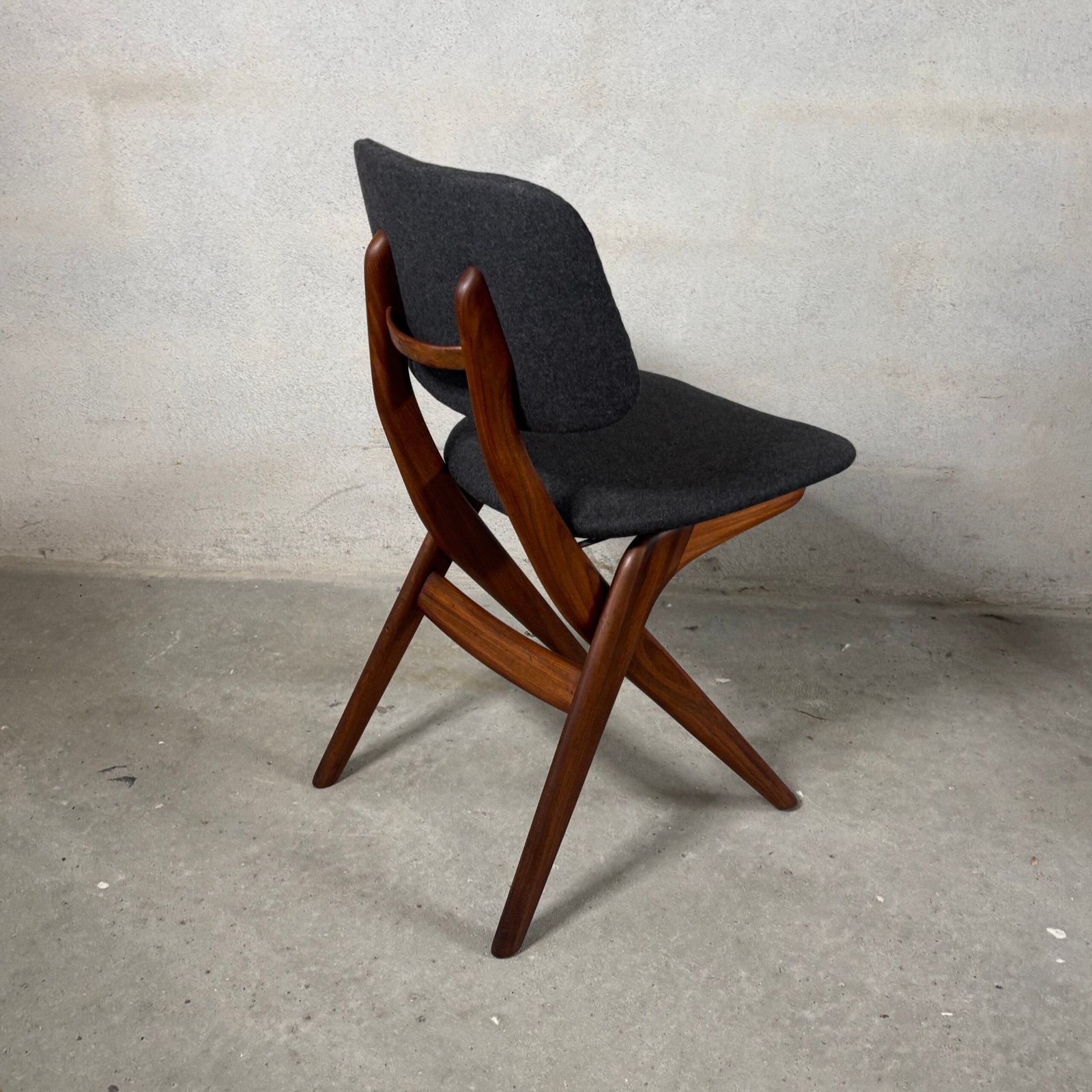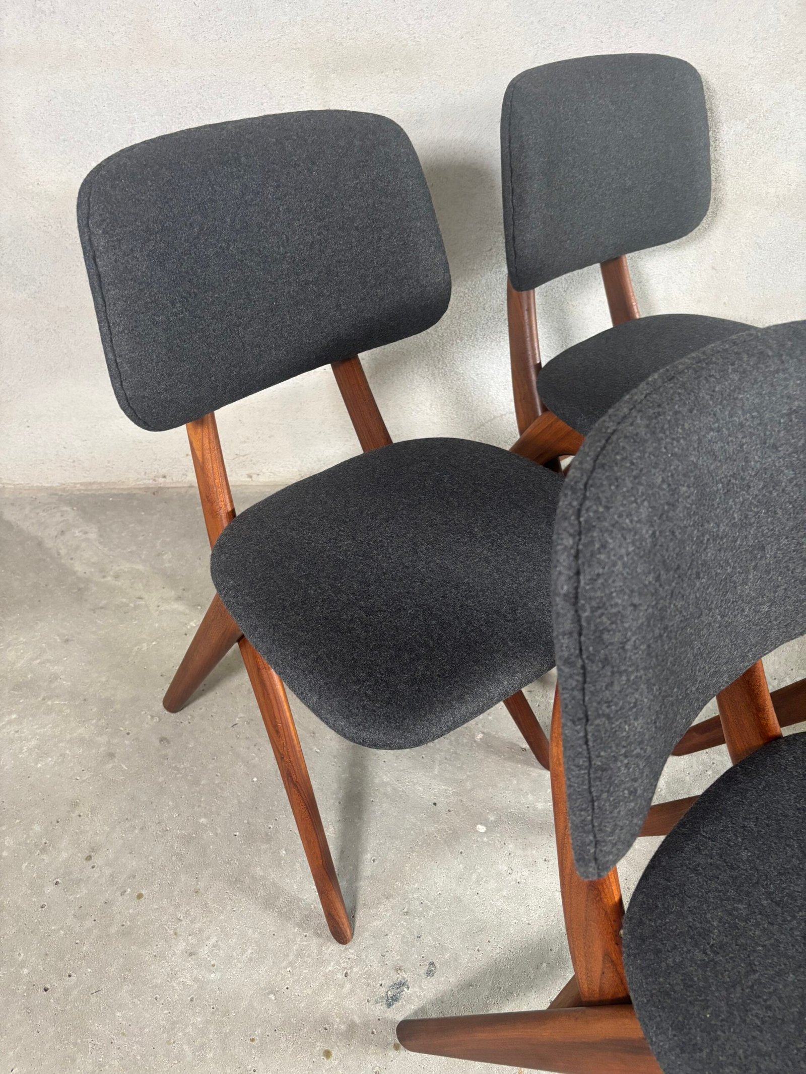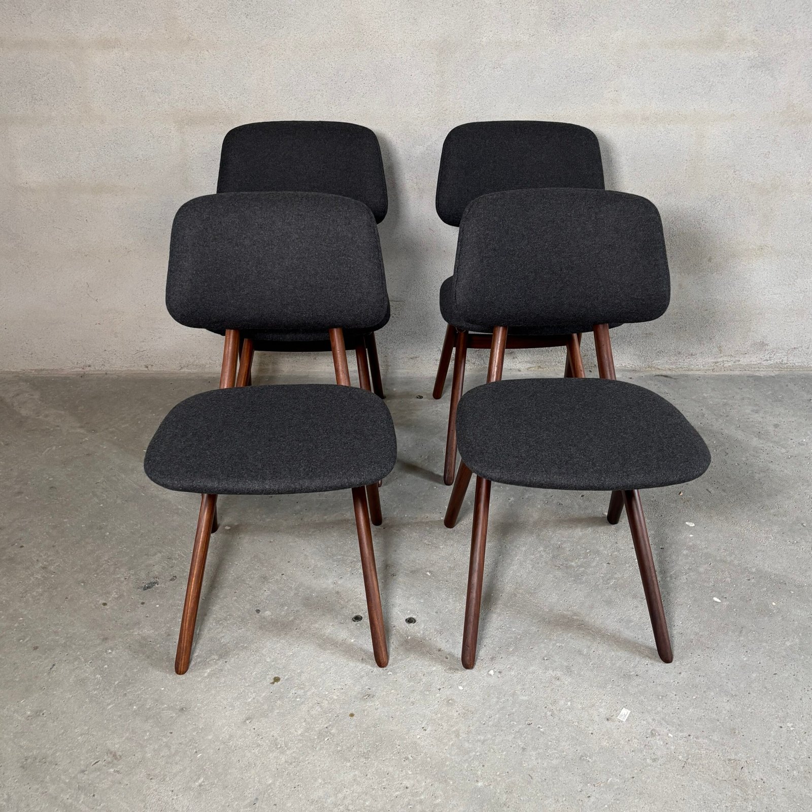 Fully restored and newly reupholstered in dark grey wool fabric, these chairs highlight the sculptural lines and refined craftsmanship that define van Teeffelen’s work and the Dutch modern aesthetic.
